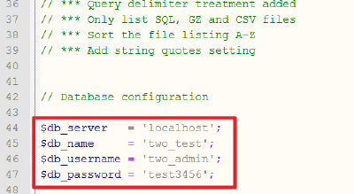 將下載來的檔案解壓縮後,打開「bigdump.php」,進行資料庫帳號、使用者帳號及密碼等設定。按Ctrl+F搜尋「$db_server」,再將實際資料庫資料填入: