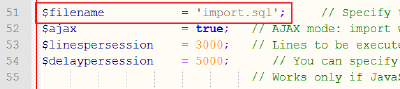 $filename = ‘檔案名稱.sql’; $ajax = true; $linespersession = 3000; (設定每次還原幾筆資料) $delaypersession = 5000; (每次間隔休息時間,設定5000為休息5秒鐘。)