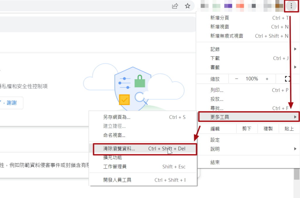 - 點擊右上角的菜單圖示,然後選擇「更多工具」→「清除瀏覽資料」。