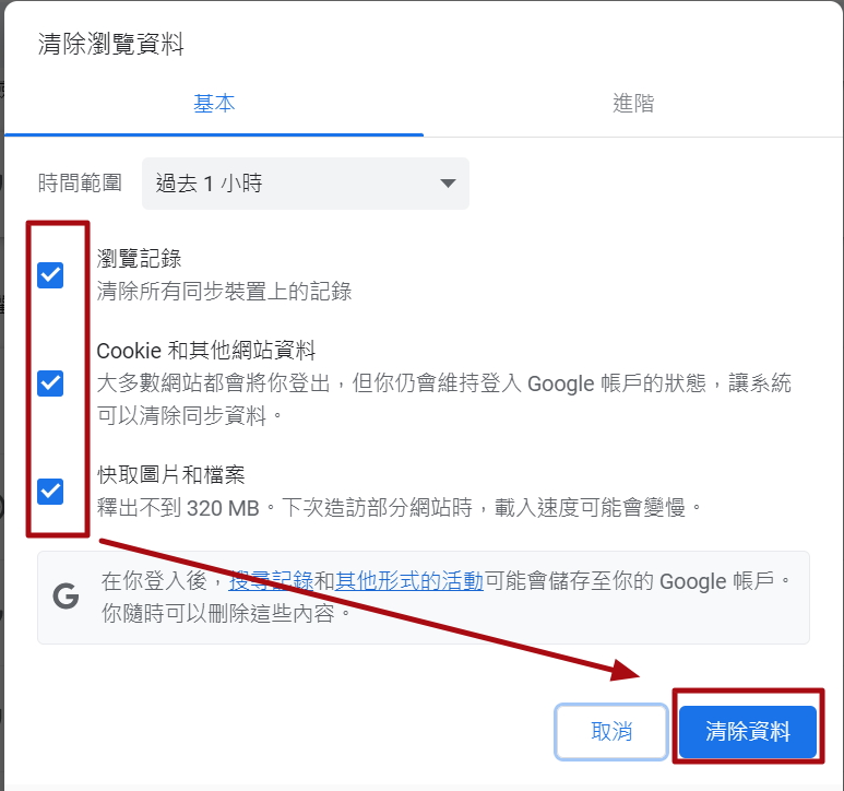 - 勾選「圖像和檔案快取」和「cookie 和其他網站資料」。